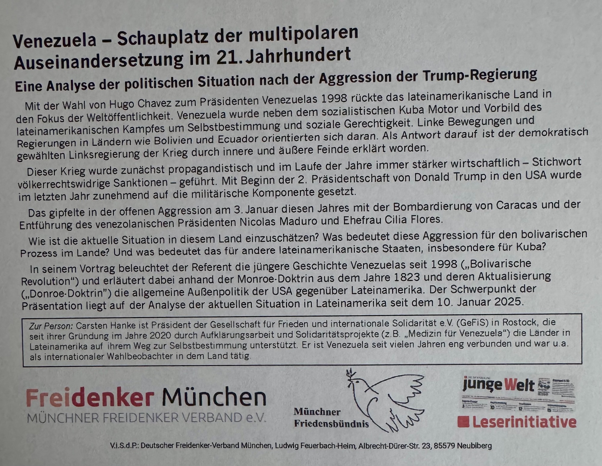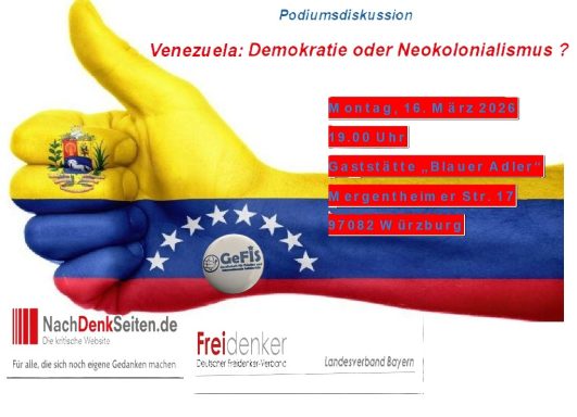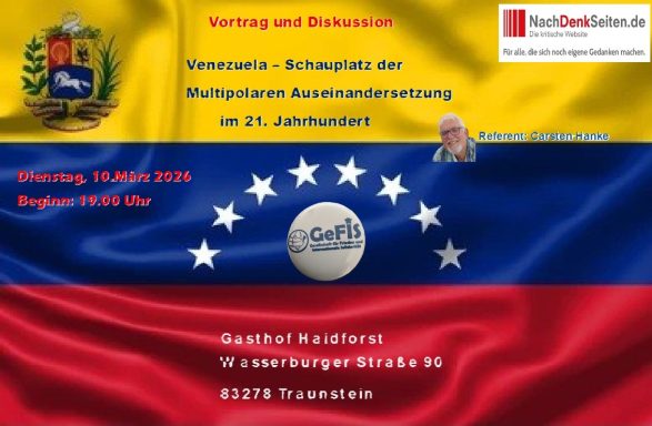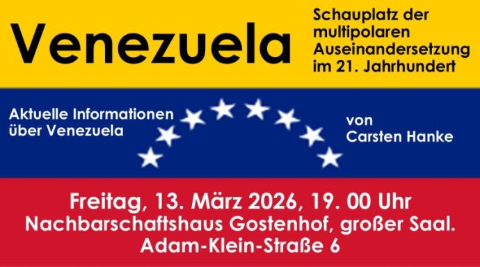 Am 31.01.2026 wird in der Hansestadt Rostock eine Podiumsveranstaltung zum Thema der USA-Aggression am 03.01.2026 in Venezuela stattfinden, die darüber hinaus auch den geopolitischen Aspekt mit einbezieht. Nachdem Input-Vortrag, der wie immer in einer Power Point Präsentation die Grundlage für die anschließende Diskussion bildet, freuen wir uns stets auf den sachlich geführten Gedankenaustausch. Der Eintritt ist frei !!!!