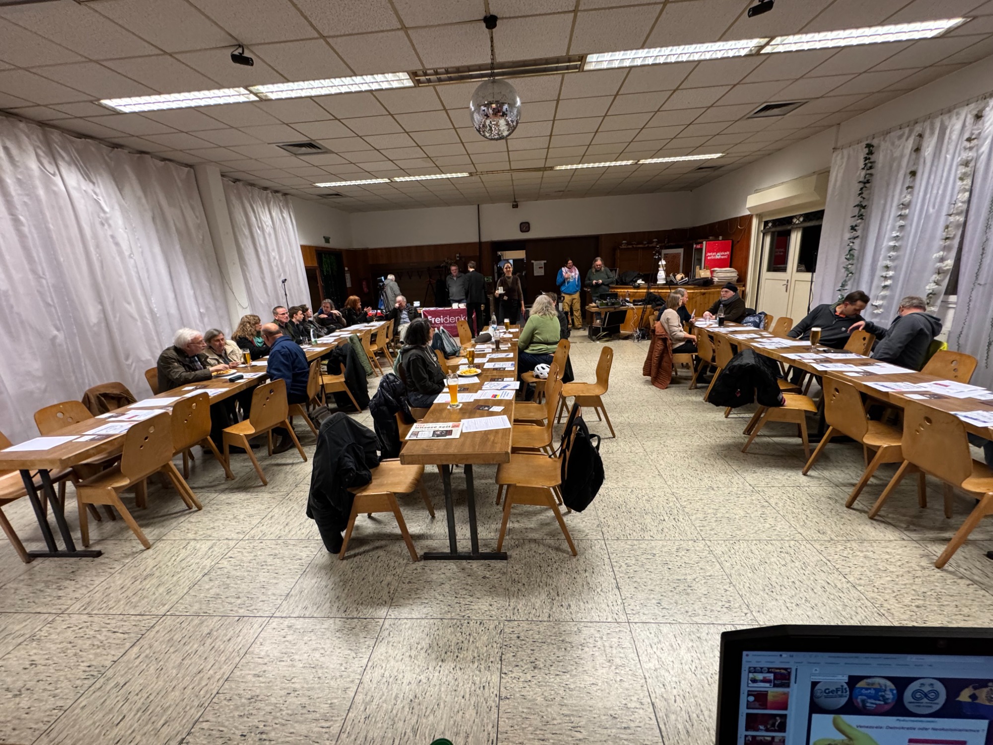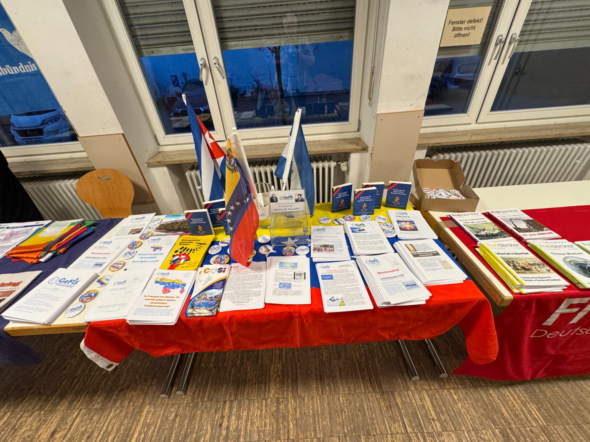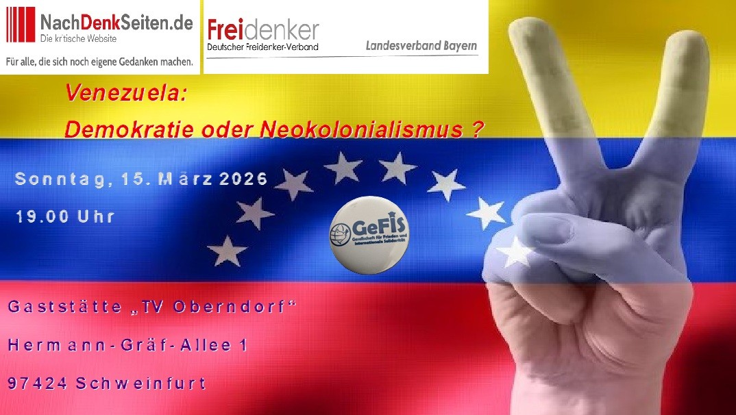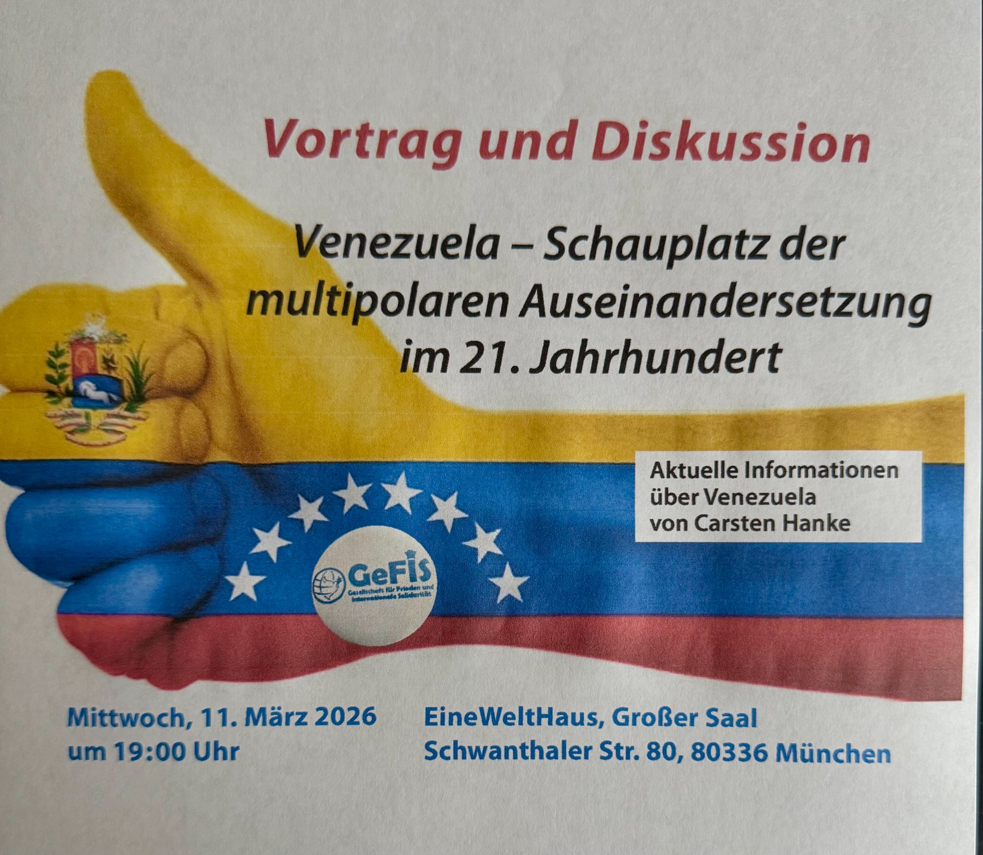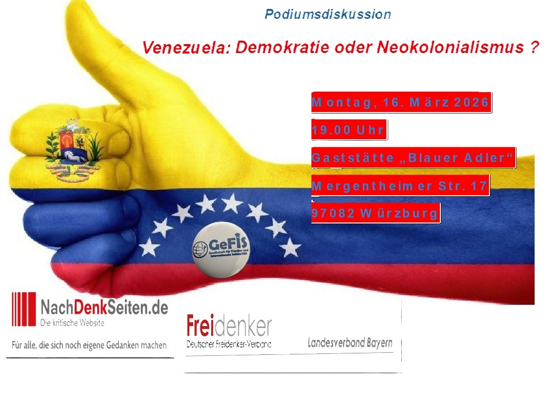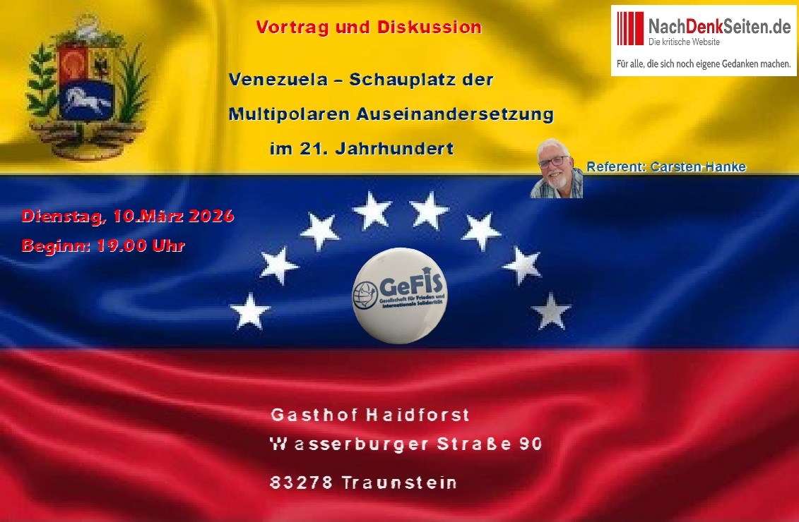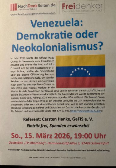 Auf Einladung der Organisationen SDAJ, CubaSi und KpF der Partei Die Linke, fand am 17.1.2026 am späten Nachmittag eine vom GeFiS-Mitglied referierte Informationsveranstaltung über die aktuelle Lage in Venezuela statt. Nach einem ca. 1 stündigen Vortrag fand eine sehr aufgeschlossene ca. 4,5 Stunden lang Diskussion statt. Die Referenten des GeFiS sind stets daran interessiert, dass möglichst keine Frage der Teilnehmer unbeantwortet bleibt. Das ist leider nicht immer möglich, weil die angemieteten Räumlichkeiten nur in einem bestimmten Zeitrahmen zur Verfügung stehen. In diesem Fall waren wir alle in der glücklichen Lage, dass es keinen Zeitrahmen gab.
