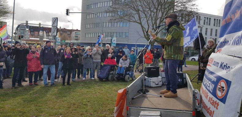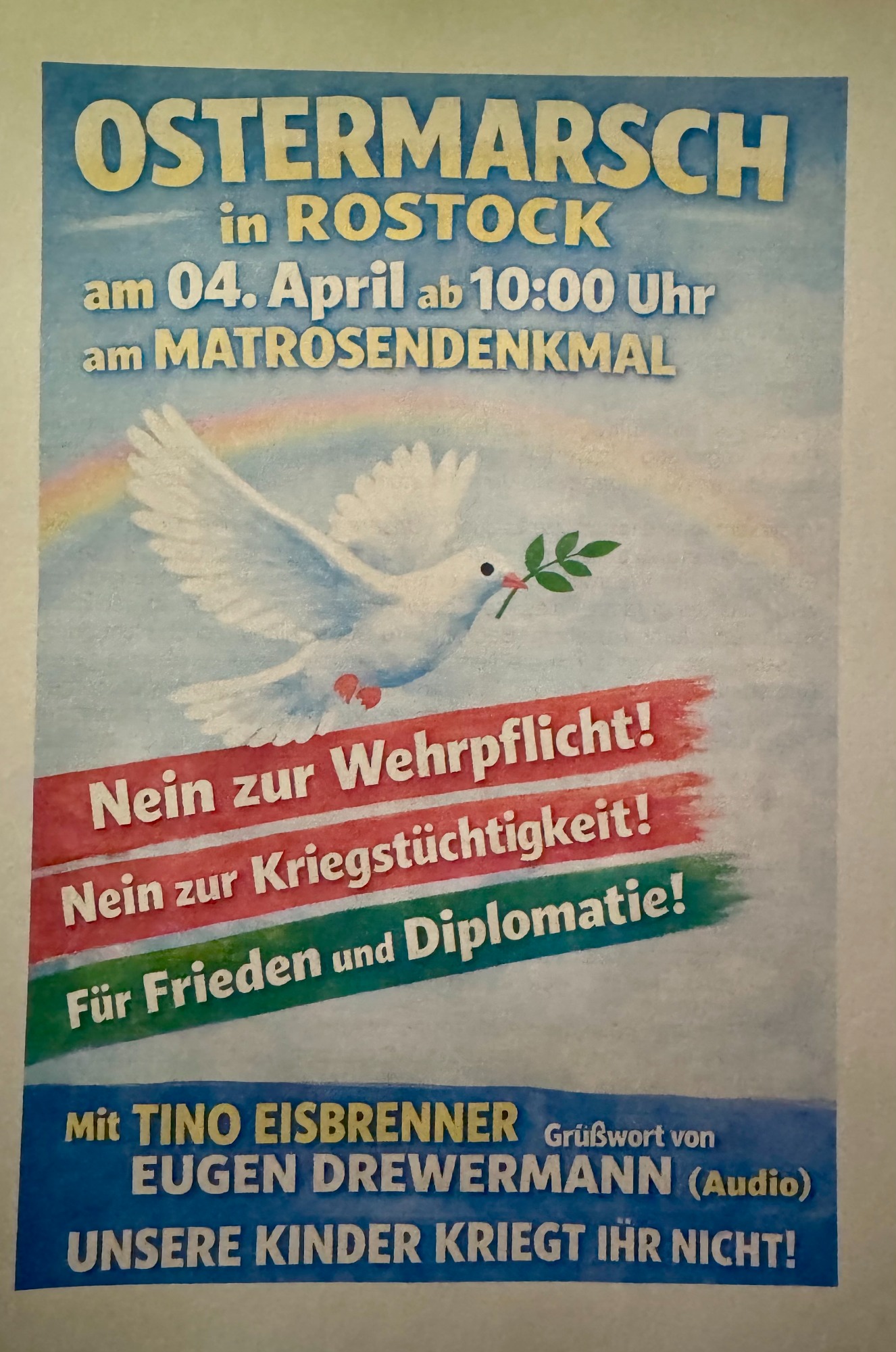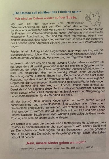 Ca. 300 Teilnehmer sind dem Aufruf des Norddeutschen Friedensbündnisses gefolgt, welches am Denkmal der revolutionären Matrosen in Rostock am Warnowufer um 10.Uhr begann. Mit verschiedenen Rednern, hat auch der bekannte Sänger Tino Eisbrenner mit verschiedenen Friedensliedern einen kulturellen Beitrag geleistet. Es folgte eine Demonstration durch den Stadtteil Kröpeliner Tor Vorstadt (KTV) hin zum Doberaner Platz, wo nach weiteren friedenspolitischen Aktivitäten gegen 12 Uhr der diesjährige Ostermarsch zu Ende ging.