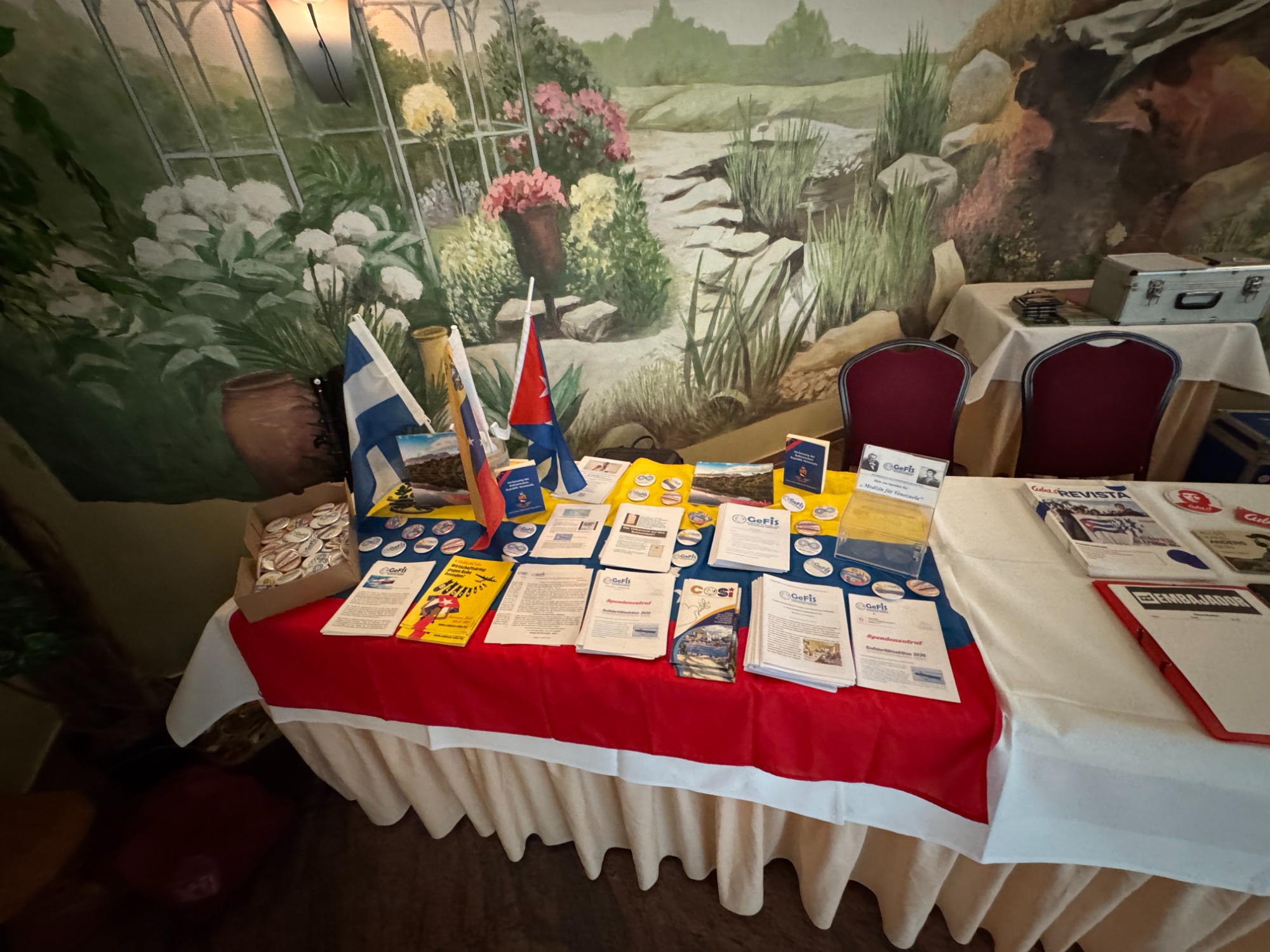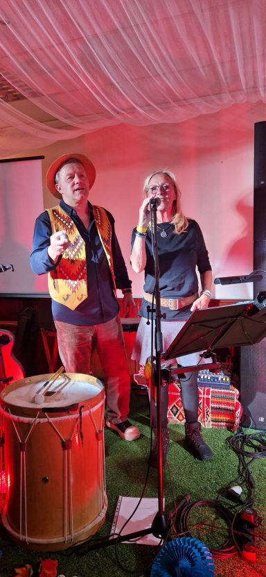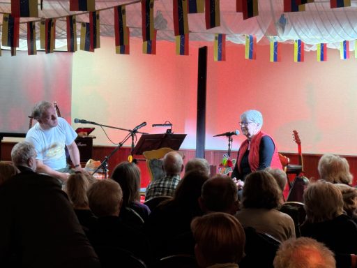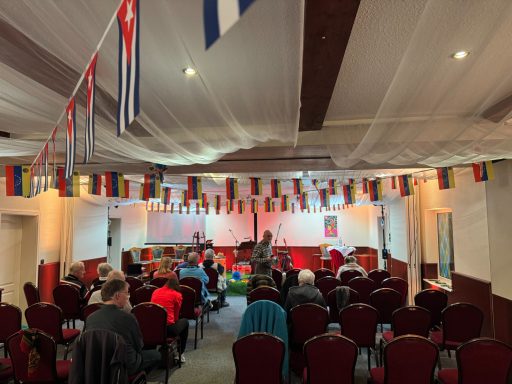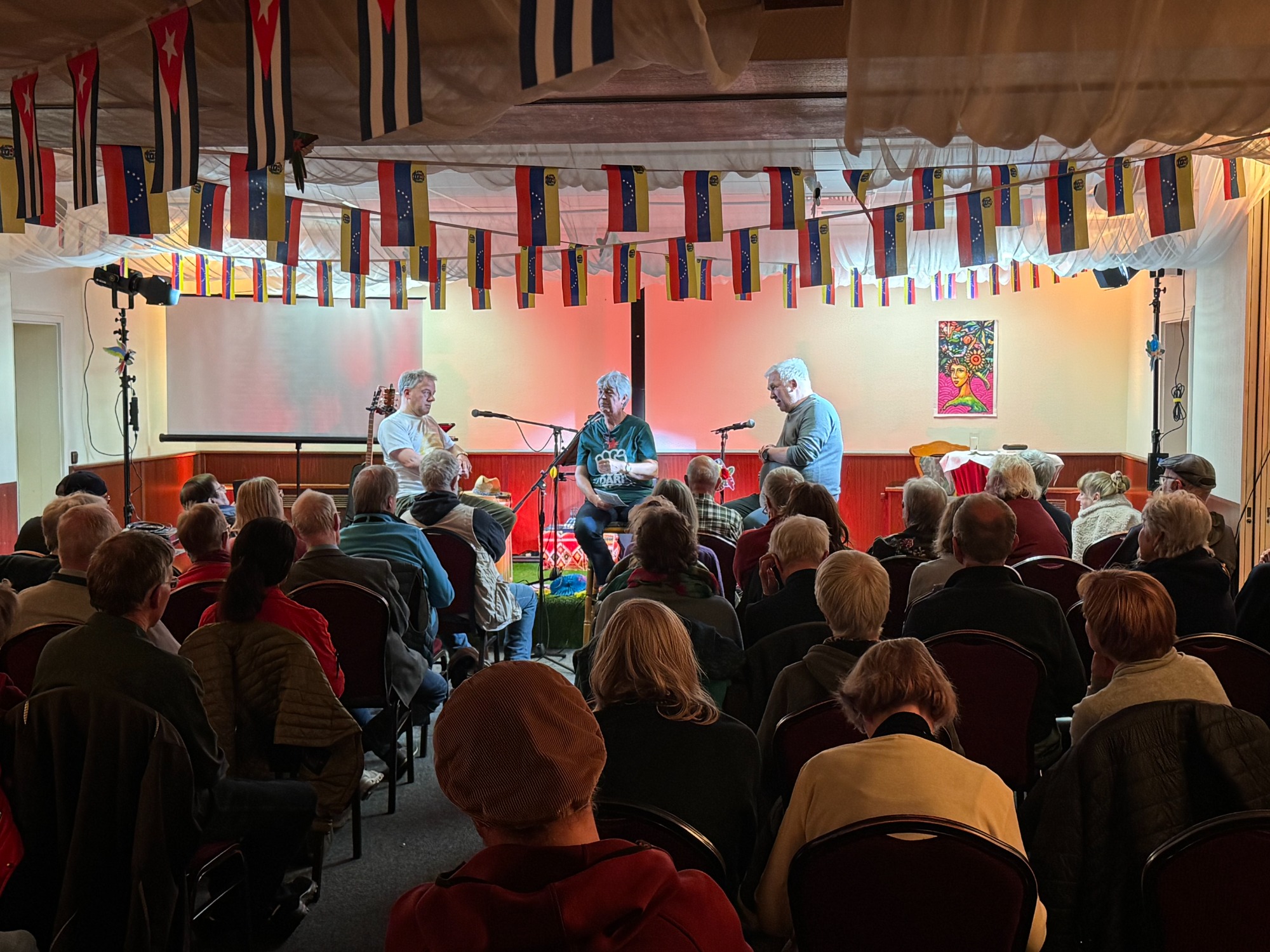 Unter LaTINOamerikacano stand die thematische Ausrichtung fest. Es ging vornehmlich, um die solidarische Unterstützung der fortschrittlichen Kräfte Lateinamerikas und hier im speziellen um Kuba und Venezuela. Genau jene zwei Länder, die seit 2026 aufgrund der völkerrechtswidrigen Aggressionen der USA gegenüber beiden Ländern im besonderen Focus der Weltöffentlichkeit stehen. Neben den vielfältigen lateinamerikanischen Liedern, die Tino und sein Gesangspartner an diesem Wochenende Tobias Thiele und als weiteren Gast Lautaro Valdez einen chilenischen Sänger, der vor der faschistischen Pinochet-Regierung flüchten musste, ein breites musikalisches Programm präsentierte. Diese Gesangseinlagen, die jede für sich genommen, schon ein unvergessliches Erlebnis boten, wurden mit vielen Gedichten von Pablo Neruda den Nobelpreisträger für Kultur, abwechslungsreich ergänzt. Des Weiteren wurde in einem längeren Interview mit den Vertretern von CubSi und GeFiS über die aktuelle Lage in Kuba wie in Venezuela den anwesenden Gästen ein ganz aktuelles Bild geboten. Im Anschluss wurden Fragen der interessierten Teilnehmer beantwortet.