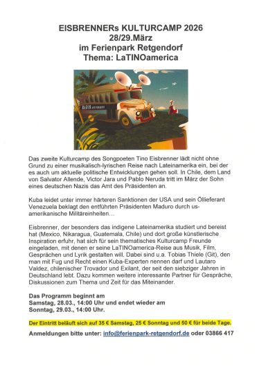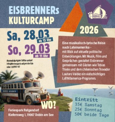 Am letzten März-Wochenende 2026, fand in Retgendorf das II Kulturcamp statt. Eingeladen hatte erneut der Künstler, Sänger, Poet Tino Eisbrenner, der mit dem Organisator Henry Marek zum wiederholten Mal, ihre organisatorische Klasse unter Beweis stellten.
