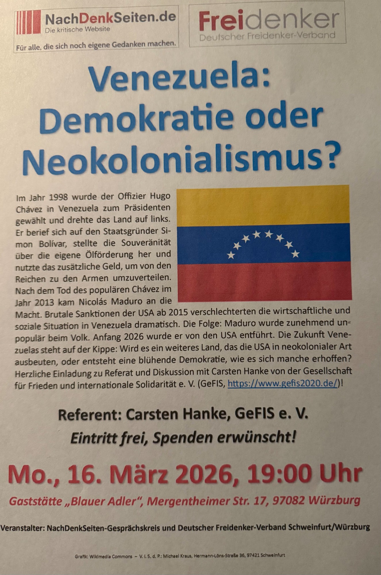 Am 21.03.2026 fand auf Einladung der Regionalgruppe des RotFuchs e.V. in Neubrandenburg ein weiterer Vortrag zur Situation in Lateinamerika und hier im speziellen zu Venezuela statt.