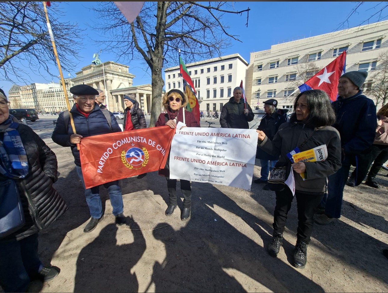 Internationaler Protesttag 3. Feb. 2026 um 18 Uhr vor der US Botschaft Berlin am Pariser Platz / Gegen die US-Interventionen in Lateinamerika und in der Karibik! Freiheit für Präsident Maduro und Cilia Flores! Der amtierende venezolanische Präsident Nicolas Maduro und seine Ehefrau und Parlamentsabgeordnete Cilia Flores wurden als Geiseln in einer Spezialoperation der USA mit mehr als 100 Toten am 3. Januar 2026 in Venzuelas Hauptstadt Caracas entführt und vor ein New Yorker Gericht gezerrt. Bereits seit dem Sommer 25 exekutierte die akuelle Trump-Administration im karibischen Meer und im Ostpazifik einen nicht-erklärten Krieg gegen Venezuela und andere karibische Staaten, dem bisher ebenfalls mehr als 100 Menschen zum Opfer fielen. Der Coup der USA in Venezuela vom 3. Januar mit der Entführung des Präsidenten ist eine schwere Verletzung Völkerrechts. Wir fordern heute deshalb mit vielen anderen Protestanten in anderen Teilen der Welt die sofortige Freilassung von Präsident Maduro und Cilia Flores aus US-amerikanischer Haft und ihre umfassende Rehabilitation YANKEES,