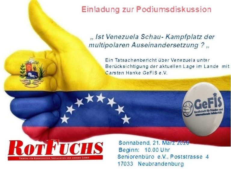 Am 21.März 2026 lädt die Regionalgruppe des RotFuchs Förderverein e.V. Neubrandenburg gemeinsam mit dem GeFiS zu einer Podiumdiskussion zum Thema Venezuela, wo neben der aktuellen Lage auch der geopolitische Bezug thematisiert wird.