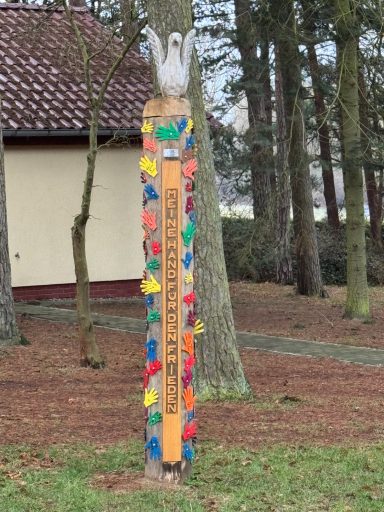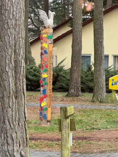 Der im Ferienpark Retgendorf platzierte Friedenspfahl, ist nicht nur optischer Beleg für den Charakter der kulturellen Veranstaltungen dort, er drückt auch den Willen der Gäste aus, die sich hier aufhalten und ist gleichzeitig Aufforderung an jeden einzelnen Menschen, sich für den Frieden einzusetzen, ohne Waffen.