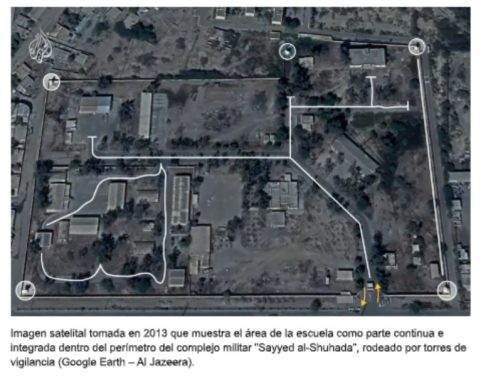 Visuelle Analyse: Die Militärbasis (rot) und die (grüne) Schule wurden erreicht; die Kliniken (gelb) wurden genau ausgeschlossen (Al Jazeera).