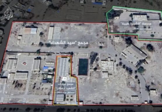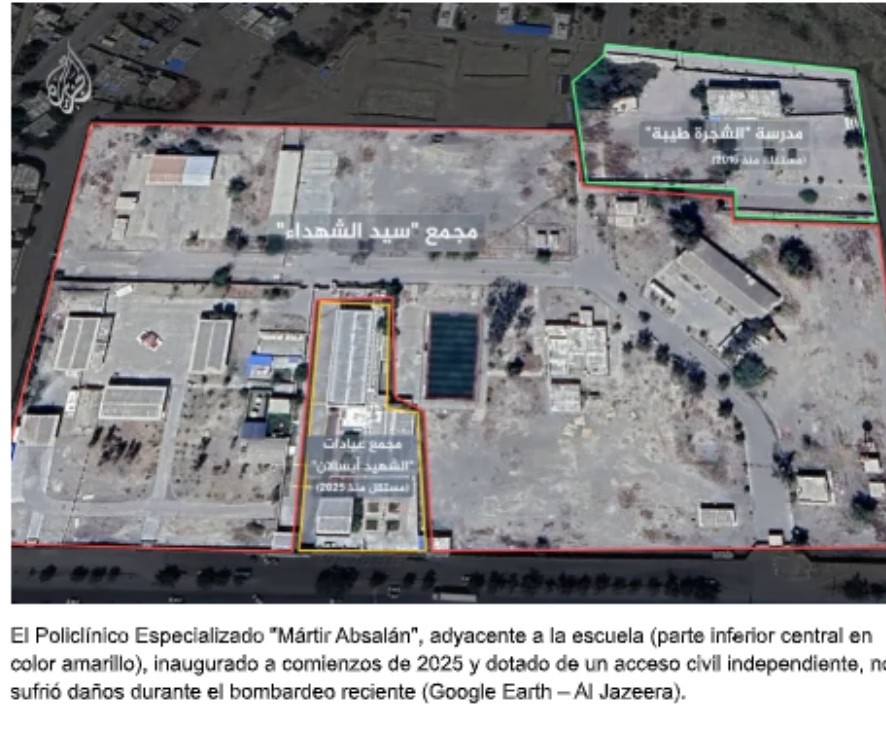 Die Spezialisierte Poliklinik „Märtyrer Absalán“ (Mitte, gelbe Farbe), die 2025 eingeweiht wurde, wurde nicht beschädigt (Google Earth – Al Jazeera).