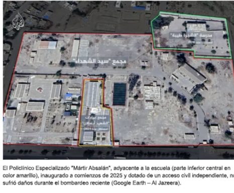 Am 14. Januar 2025 (nur ein Jahr vor dem Angriff) eröffnete der Kommandeur der Revolutionsgarden, General Hossein Salami, das spezialisierte medizinische Zentrum „Mártir Absalán“ an einem anderen Ende des ursprünglichen Komplexes.14 de enero de 2025 Dieses auf 5.700 Quadratmetern gebaute Zentrum wurde mit fortschrittlicher Technologie und zivilen Spezialitäten wie Pädiatrie und Geburtshilfe ausgestattet, was seine streng zivile Natur bestätigt.
