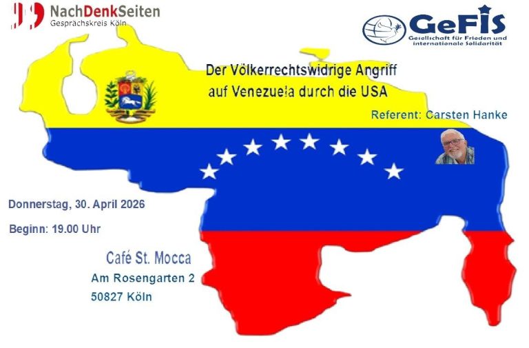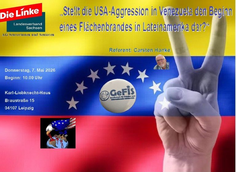 Am Donnerstag den 07.Mai 2026 findet in Leipzig (siehe Bild) eine Podiumsveranstaltung zur aktuellen Lage in Venezuela statt. Hier wird der Referent Carsten Hanke von der Gesellschaft für Frieden und internationale Solidarität (GeFiS e.V.) mit Tatsachenberichten über Venezuela über eine Power Point Präsentation, die interessierten Teilnehmer informieren. Im Anschluss freuen wir uns auf eine sachlich geführte Diskussion, wo neben Meinungsäußerungen auch gerne bestehende Fragen beantwortet werden. Der Referent selbst ist seit 7 Jahren regelmäßig in Venezuela, um praktische Solidarität im Auftrag des GeFiS durchzuführen. Ebenso ist der Referent seit 2020 internationaler Wahlbeobachter und hat alle Wahlen, mit anderen internationalen Wahlbeobachtern kontrolliert und begleite