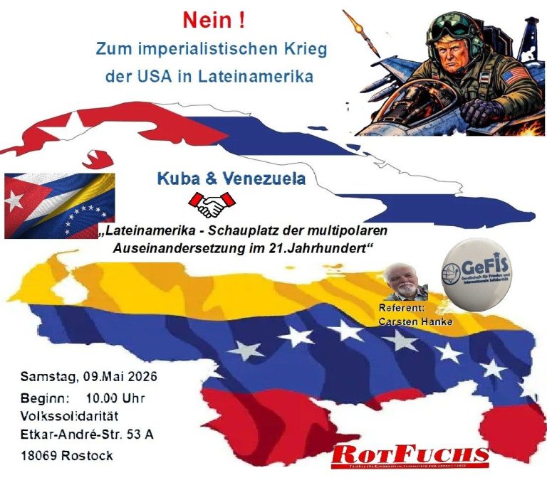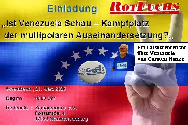 Am 21.März 2026 lädt die Regionalgruppe des RotFuchs Förderverein e.V. Neubrandenburg gemeinsam mit dem GeFiS zu einer Podiumdiskussion zum Thema Venezuela, wo neben der aktuellen Lage auch der geopolitische Bezug thematisiert wird.