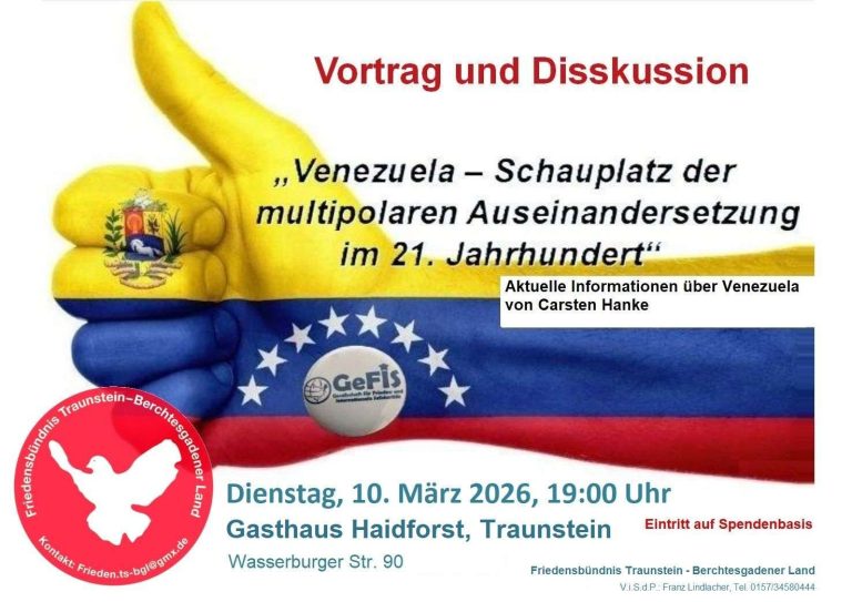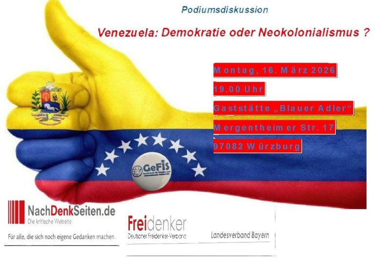 Am 16.3.2026 um 19 Uhr beginnt in Würzburg auf gemeinsamer Einladung der NachDenkSeiten und des Freidenker Verbandes eine Podiumsdiskussion zum Thema Venezuela, wo das GeFiS-Mitglied Carsten Hanke referieren wird. Nachdem Vortrag wird, traditionell in bewerterweise eine Diskussion folgen, wo die interessierten Gäste ihre Fragen stellen können bzw. ihre Meinungen zum Thema äußern.