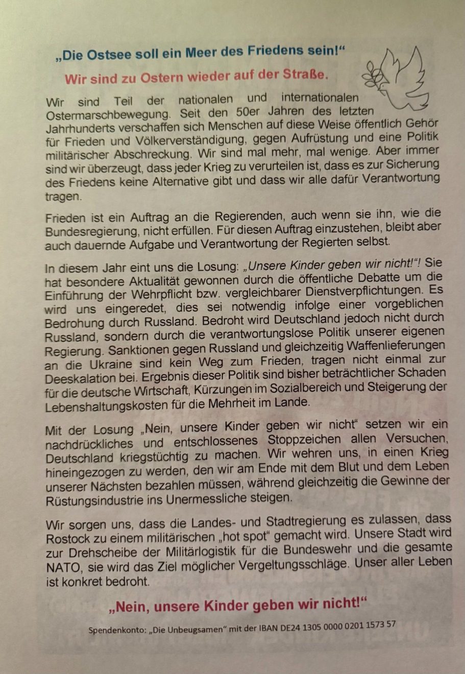 Mit der Losung „Nein, unsere Kinder geben wir nicht“ setzen wir ein nachdrückliches und entschlossenes Stoppzeichen allen Versuchen, Deutschland kriegstüchtig zu machen. Wir wehren uns, in einen Krieg hineingezogen zu werden, den wir am Ende mit dem Blut und dem Leben