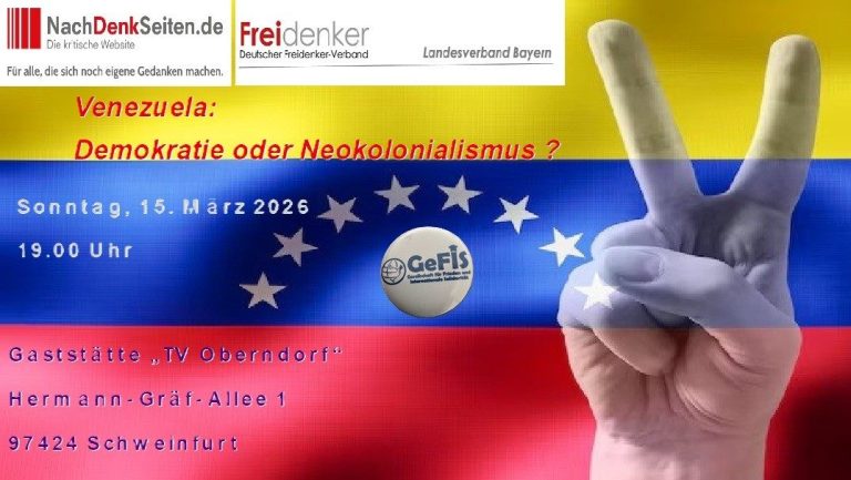 Zum 15. März 2026 werden alle interessierte Menschen zum Vortrag über die aktuelle Lage in Venezuela nach Schweinfurt herzlichst eingeladen. In einer Co. Produktion des Leserkreises NachDenkSeiten und des Freidenker Verbandes wird als Gastreferent Carsten Hanke von der Gesellschaft für Frieden und internationalen Solidarität (GeFiS e.V.) mit einem Tatsachenbericht über Venezuela über eine Power Point Präsentation die anwesenden Teilnehmer informieren. Im Anschluss besteht die Möglichkeit des Meinungsaustausches und der Fragestellung, die der Referent gerne beantworten wird.